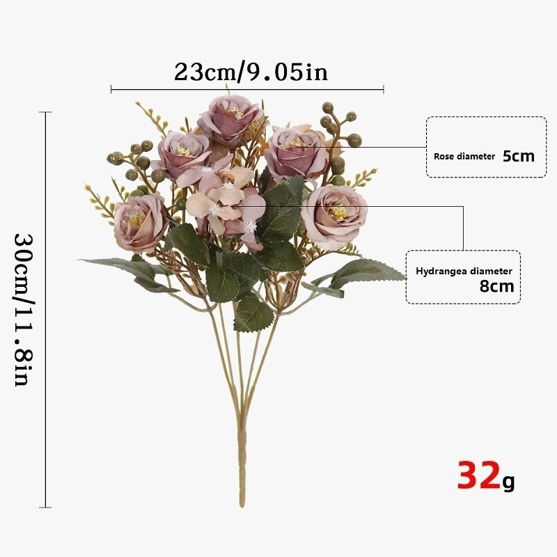 Fabriqué à partir de matériaux de haute qualité, notre bouquet est composé de roses en soie délicates et de feuilles en soie, montées sur une tige en plastique résistante. Avec une hauteur de 30 cm et un diamètre de 23 cm, ce bouquet est idéal pour créer des arrangements variés. Chaque rose mesure environ 5 cm, tandis que les fleurs d'hortensia ajoutent une touche de volume avec un diamètre de 8 cm. Ce choix de matériaux garantit non seulement une apparence réaliste, mais également une durabilité qui vous permettra de profiter de votre bouquet pendant de nombreuses années.