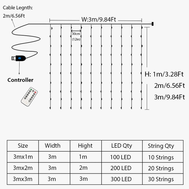 La guirlande lumineuse est disponible en plusieurs dimensions : 3mx1m, 3mx2m, ou 3mx3m, vous permettant de choisir celle qui correspond le mieux à l'espace que vous souhaitez illuminer. Avec un choix de 100, 200 ou 300 LED, vous pouvez ajuster l'intensité lumineuse selon l'ambiance désirée. Que vous souhaitiez un éclairage doux pour une soirée romantique ou une lumière plus vive pour une fête animée, cette guirlande répondra à tous vos besoins.