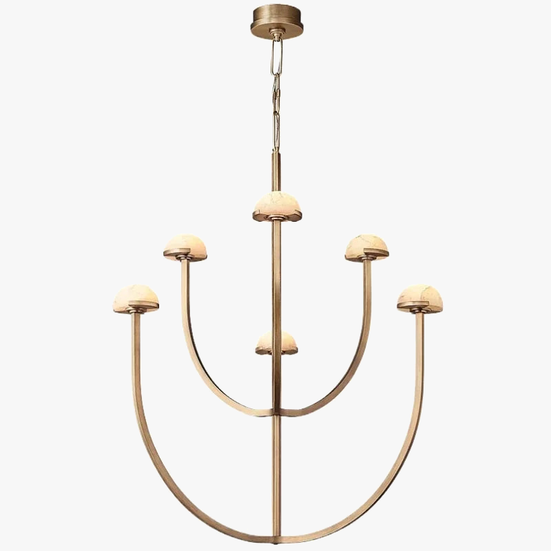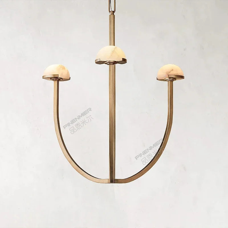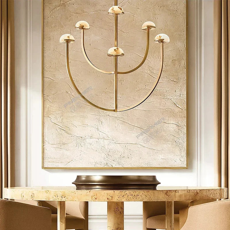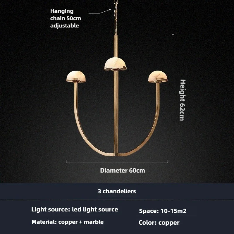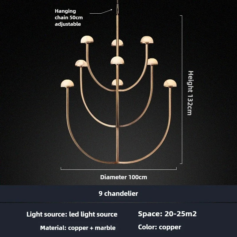Fabriqué à partir de marbre naturel espagnol, ce lustre affiche une qualité de finition exceptionnelle. Le marbre, avec ses veines uniques et sa texture luxueuse, apporte une luminosité douce et chaleureuse. Associez cela à la structure en cuivre poli qui reflète la lumière de manière spectaculaire, et vous obtiendrez un éclairage à la fois fonctionnel et artistique. Que vous le placiez au-dessus d'une table à manger pour des dîners en famille ou dans un salon pour créer une atmosphère accueillante, ce lustre saura attirer tous les regards.