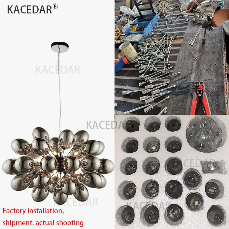 Le luminaire est constitué de multiples globes en verre, rappelant la forme des grappes de raisin. Cette caractéristique lui confère une originalité et une modernité indéniables. Les globes de verre sont maintenus par une structure en acier inoxydable, garantissant la solidité et la durabilité du lustre. La finition polie de la structure apporte une touche supplémentaire de raffinement.