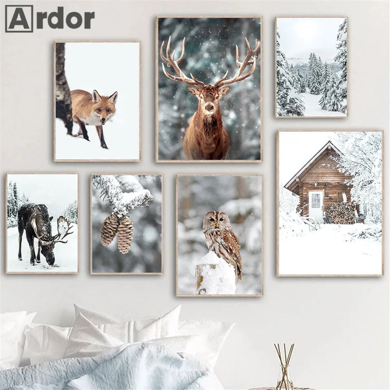 Toile murale décorative renard hibou cerf hiver forêt neige
